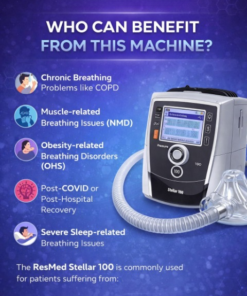 ResMed Stellar 100 is used to support patients who have difficulty breathing. It helps improve airflow and reduces strain on the lungs.