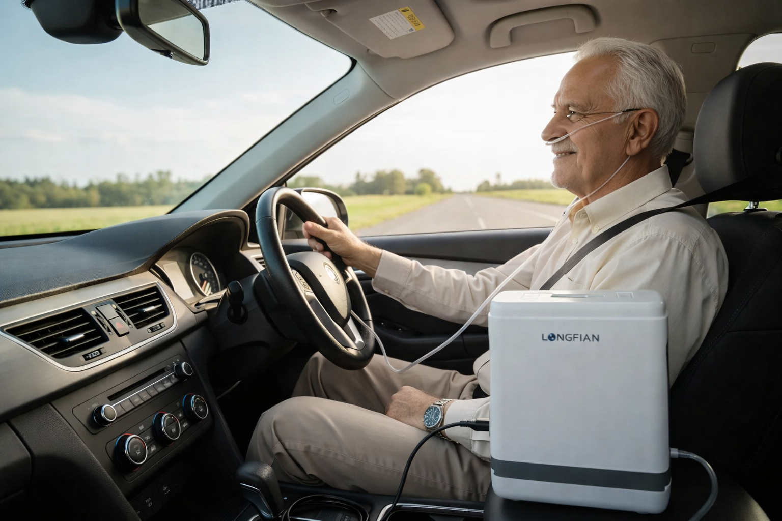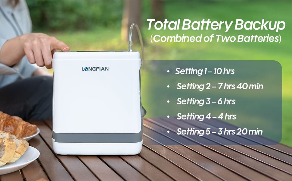 the Longfian JAY-1000P provides up to 10 hours* of backup (with combined backup of 2 batteries), ensuring uninterrupted oxygen therapy during long trips or outdoor use. It also supports DC car charging, allowing patients to stay oxygen-independent while traveling.